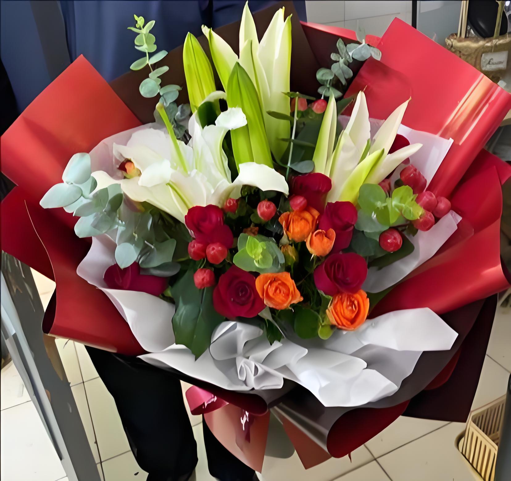 锡林郭勒盟花店包11枝红玫瑰、2枝多头白百合、6枝橙色多头玫瑰、红豆、尤加利叶